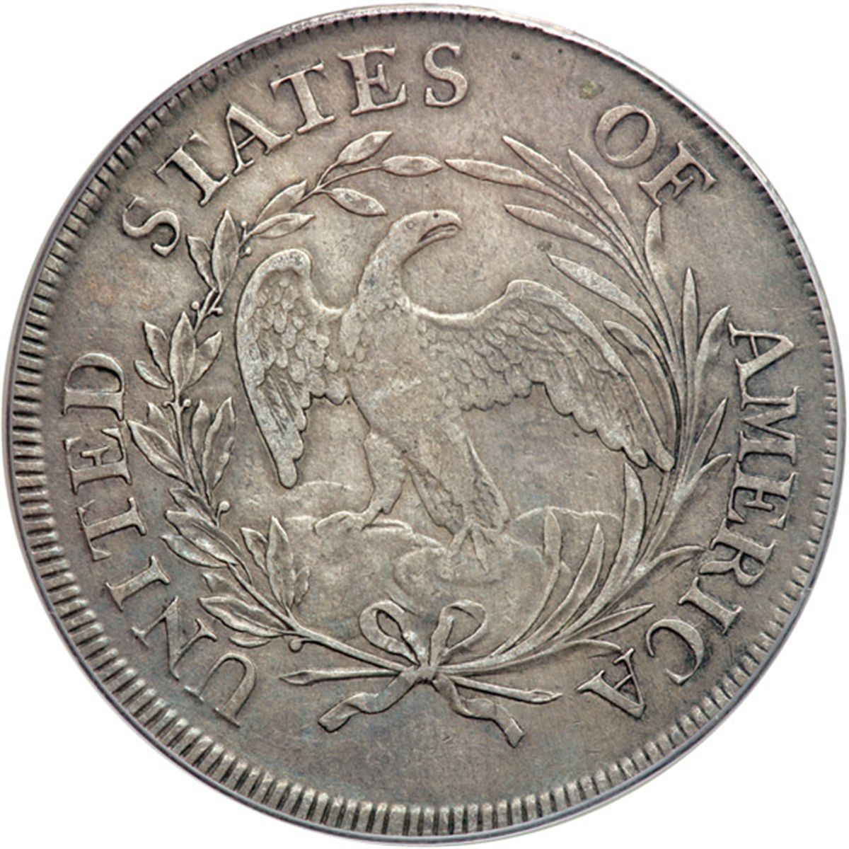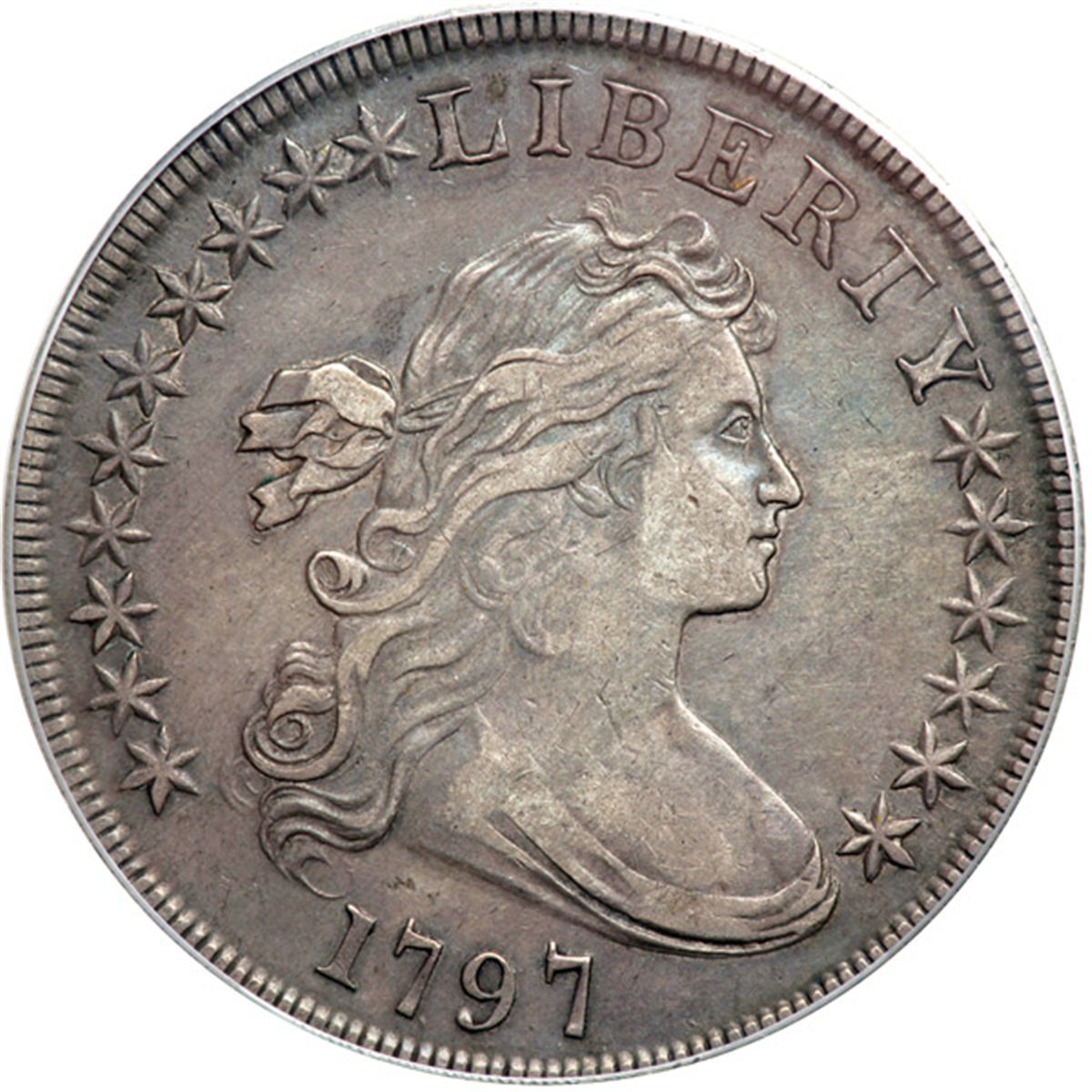 Historic Note: According to the Bowers-Borckhardt encyclopedia of Silver Dollar, in 1797 the number of stars on the silver dollar was increased to 16. The coinage is said by government reports to be the lowest of any year from 1795 to 1803, although now it is believed that the numbers given are incorrect. "I believe that most or all of the mintage of 7,776 coins reported for the calendar year may have been of earlier dates, and that most coins struck from dies dated 1797 were actually made in early 1798."