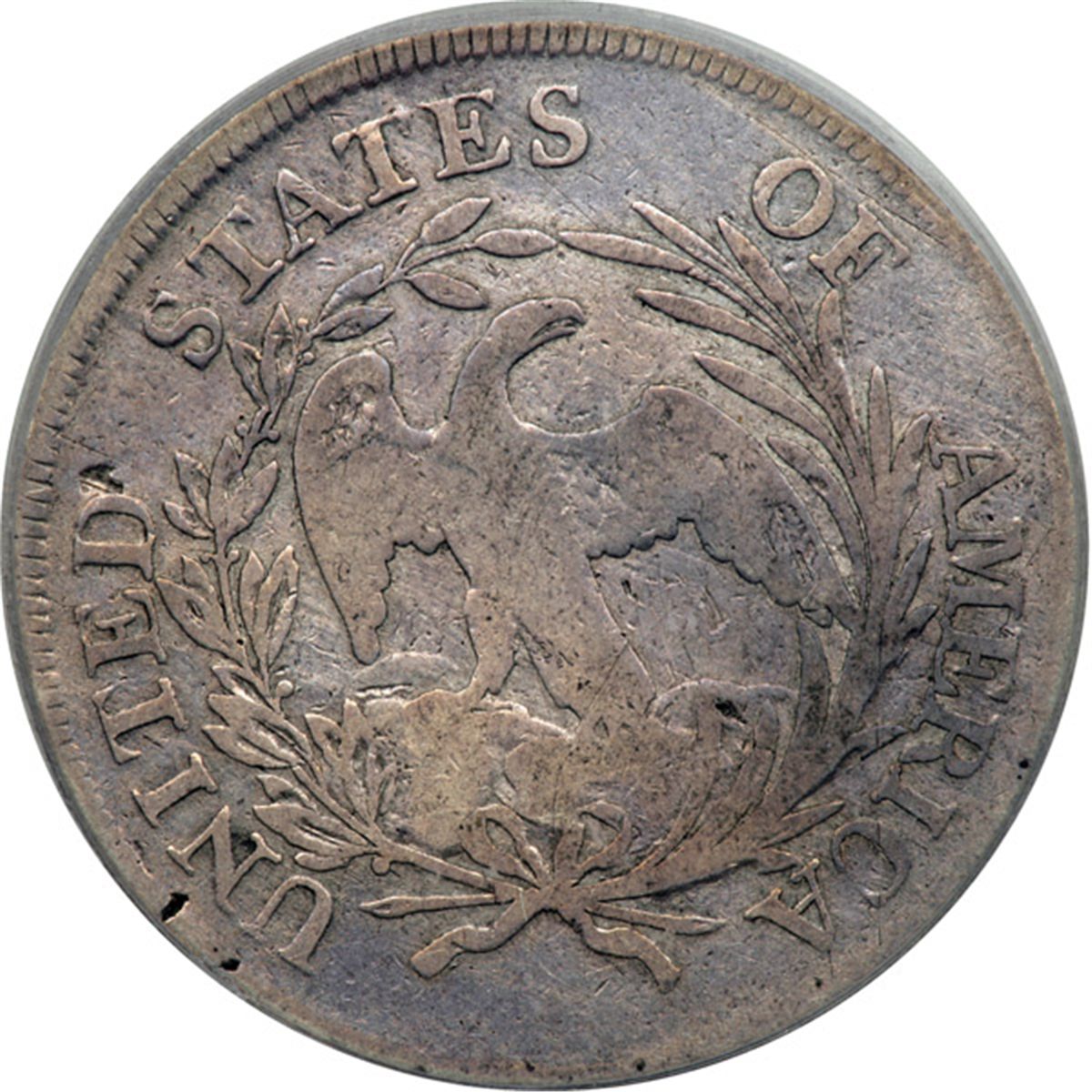 1797 Draped Bust Dollar. 10 stars left, 6 right. ICG graded Fine-15. Lightly toned with natural, even wear on the devices from its use in commerce. No injury to the rims (which is always advantageous), and bearing the desirable 1797 date. Although it is housed in a plastic slab, a friend of the cataloger calls these coins "finger coins" -- not as a derogatory term, but instead to describe their charm in holding in one's hand and flipping them over and over to see and to feel their historic connection to Early America.