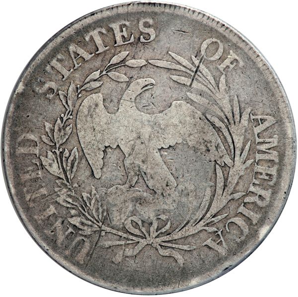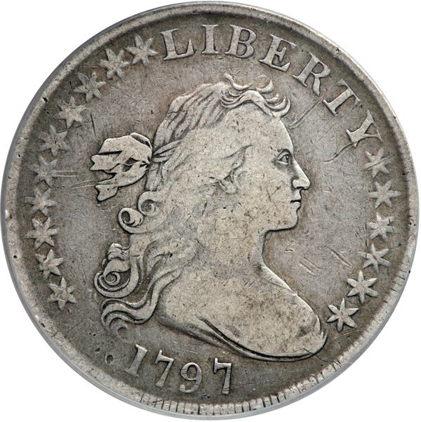 1797 Draped Bust Dollar. 10 stars left, 6 right. PCGS graded Fine-12 CAC Approved. Light even grey toning with even wear on the main features of Liberty and eagle. Has a few old shallow scuffs in the obverse field. The field itself supports medium-gray color while the high points exhibit light silvery gray by way of contrast. Very appealing. This is the scarce Draped Bust, Small Eagle Red Book type, a coin high on the want lists of many collectors. Seldom available in choice circulated condition without problems (PCGS # 6865) .