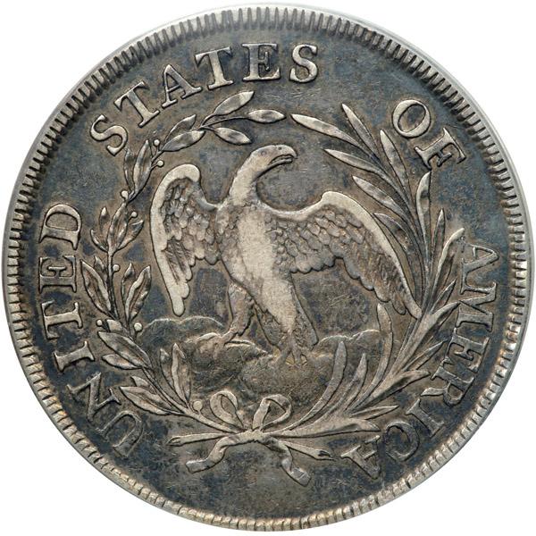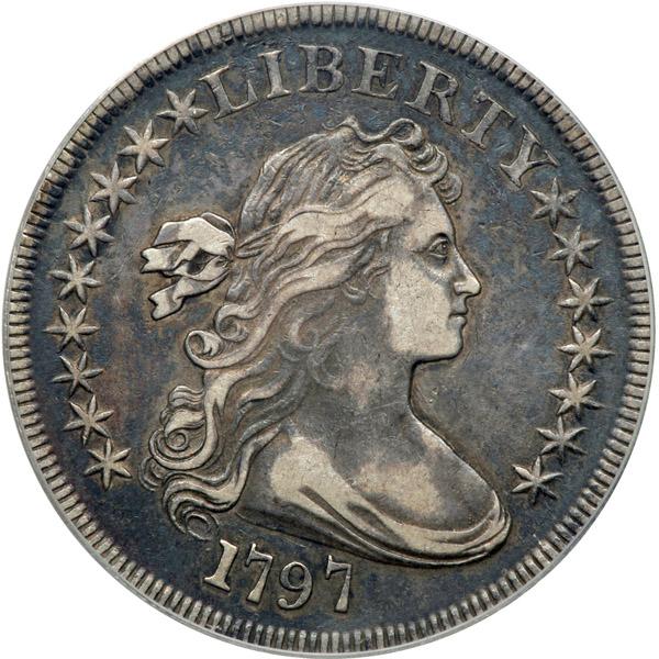1797. 9 stars left, 7 right, large letters. B-1, BB-73. Rarity 3. PCGS graded VF-30. Well struck with dark bluish-gray toning, the hair definition is much better than average on this pleasing specimen. Darkest color extends from the fields well into the devices, though offset on the cheek and higher areas on both sides by light silver-gray patina (PCGS # 6863) .