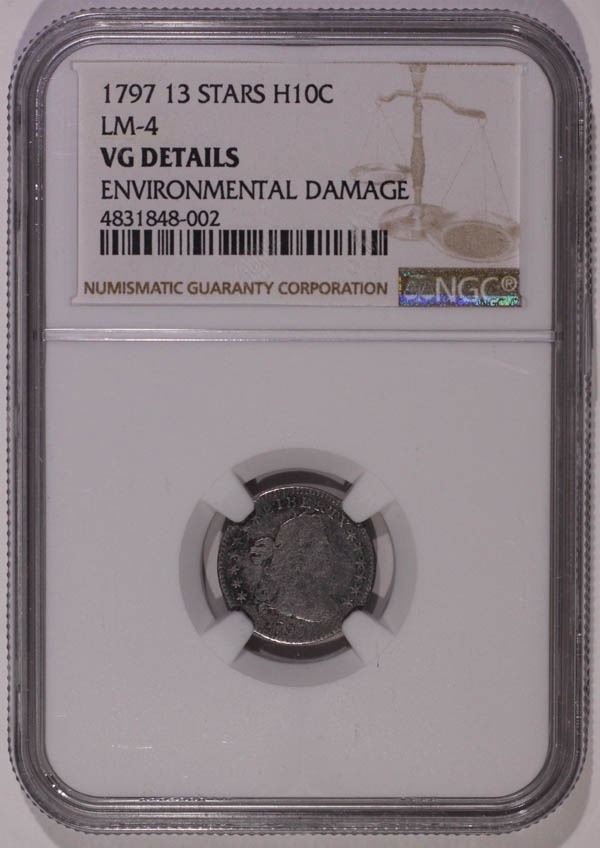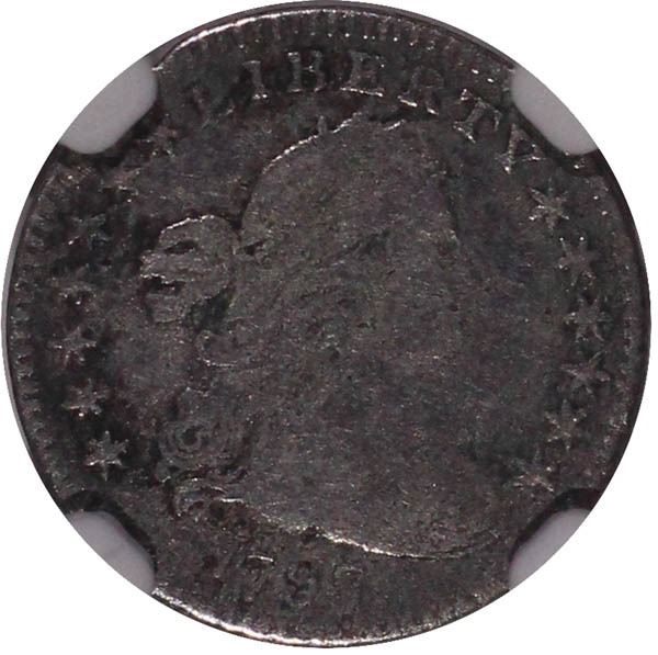 1797 Draped Bust Half Dime. 13 stars. NGC graded Details of Very Good. Environmental damage.