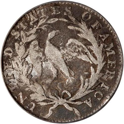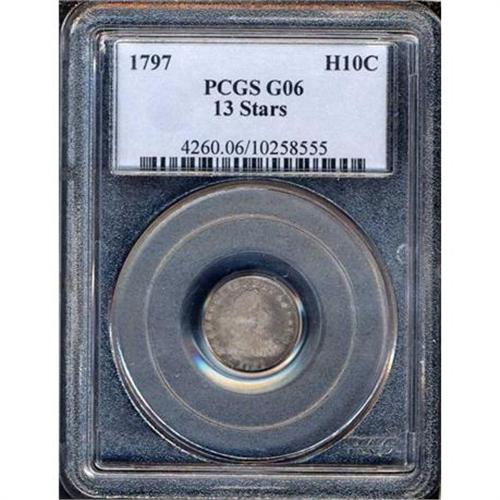<b>1797 Draped Bust Half Dime. 13 stars. PCGS graded G6.</b> The scarce draped bust, small eagle design, there were three major varieties this year created by the varying number of stars on the obverse: 13, 15, or 16. Unevenly struck, as always; very rarely seen in strict Good condition, however, and a Type set collector's delight <b>(PCGS # 4260)</b> <i>