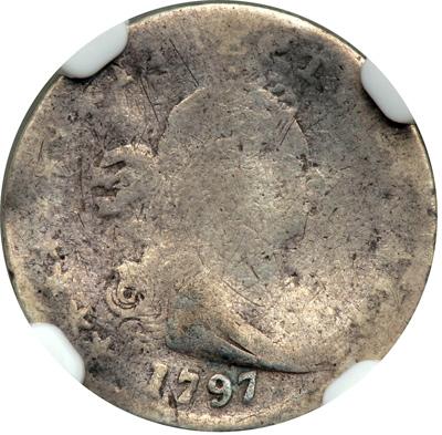 1797 Draped Bust Half Dime. . LM-1, V-2 15 stars. Bent. Clear date; partial Liberty and stars visible. This is the only variety with 15 obverse stars.