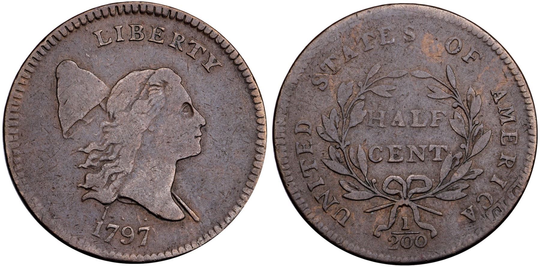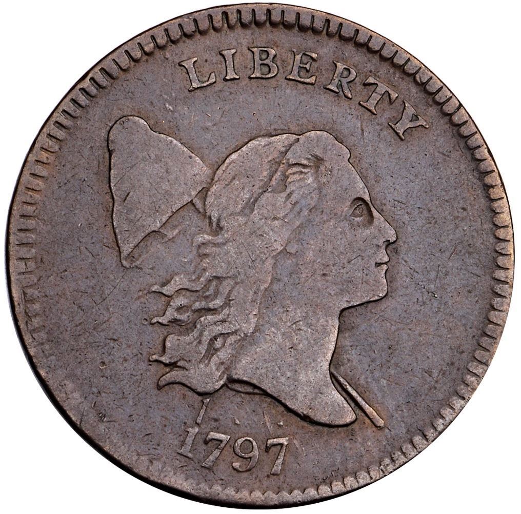 1797 C-1 R-2 1 above 1 F12Glossy dark steel brown and chocolate. The surfaces are smooth and show trivial marks visible only with the aid of a strong glass. Undertype from the cut-down Talbot Allum & Lee Cent planchet shows clearly at ICA. Virtually flawless, clear date and legends. Nicely struck EDS, Manley state 1.0.Certificate Number: Pedigree: Ex; Goldberg 5/27/2007:56 - Bob Kebler Collection