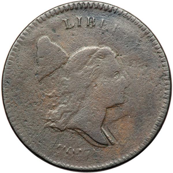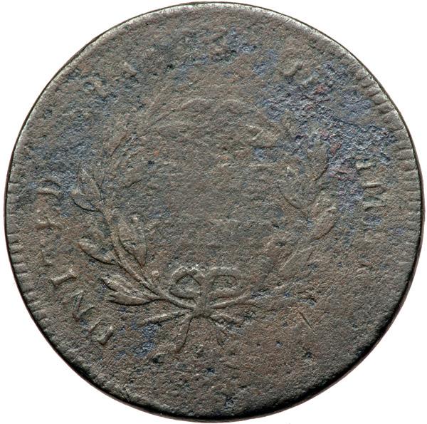 1797 C-1 R2 1 Above 1 Variety G4. Double Struck with Small Offset. Sharpness at least VG8 but covered with fine roughness. There are a few short scratches hidden in the toning under the lowest curls and traces of reddish verdigris at OF-A, but it takes a good glass to find these defects. Slightly glossy chocolate and steel with splashes of darker steel and olive toning on the reverse. Double struck. The offset (shift) between those strikes was small, perhaps a millimeter or less to K-1. Nonetheless, the doubling is obvious on the date and portrait with weaker doubling elsewhere on both sides. The 1 in the date is missing but the remaining digits read 77997, although some of the digits overlap a bit. Late die state. The swelling on the obverse is clear. Weight 88.4 grains. Davy #97.1.23.