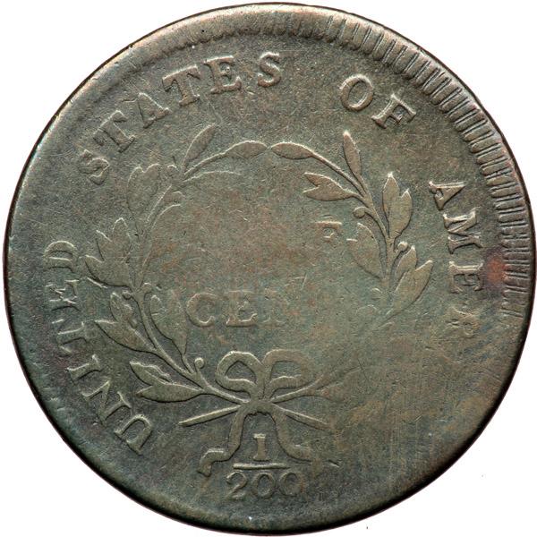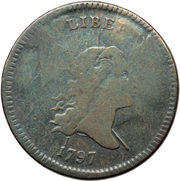 1797 C-1 R2 1 Above 1 Variety VG7. Double Struck with Tiny Offset. Glossy light olive and steel blending to chocolate brown in protected areas. Cleaned and retoned. The surfaces are perfectly smooth and void of any marks. The date is bold, including the stray 1 above the normal 1. This piece was double struck, but the offset between strikes was tiny, less than a half millimeter. Doubling is clearly visible on both sides, especially on the date, pole, and AME. VLDS, Manley state 5.0 late. The die cracks and swelling are strong and the reverse die is clearly buckled. Weight 88.2 grains. Davy #97.1.17.