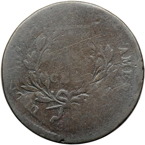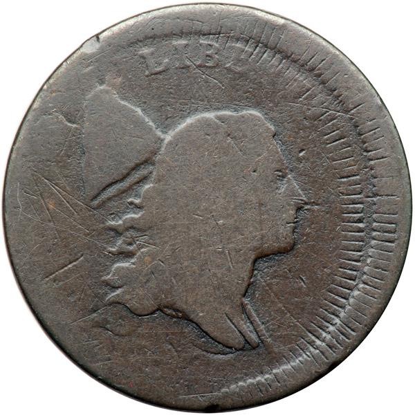 1797 C-2 R3 AG3. Double Struck Off Center. Glossy chocolate brown. No roughness or verdigris, just some hairline scratches in the obverse fields, all blended perfectly into the attractive toning. Double struck. The first strike was 15% off center to K-8 and the second was fairly well centered on the planchet but rotated about 15 degrees relative to the first. LIBERTY now reads LILIBERTY (although several of the letters are weak) and UNITED begins UNUN. The heavy wear obliterates much of the doubling but there is more than enough to see what happened here. The date is gone and the reverse displays obvious swelling, especially in the lower right quadrant. Apparently from a very late state of the dies. Weight 91.4 grains. Davy #97.2.28b.