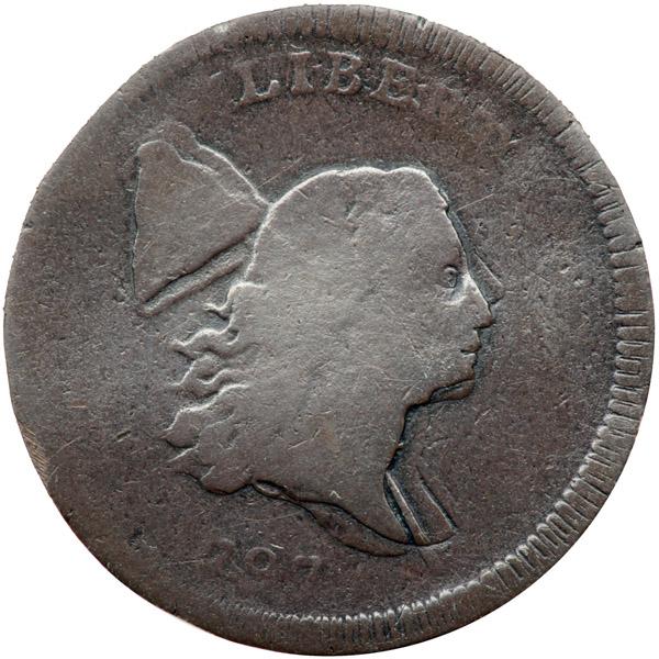 1797 C-2 R3 Fair-2. Double Struck with Rotation. Slightly sharper but the edge has been filed all the way around and the planchet displays a subtle bend or wave. The surfaces are smooth, free of any trace of corrosion or verdigris. The only marks are some very tiny pinpricks and hairlines on the upper half of the reverse. Attractive glossy chocolate brown. Double struck with a 10-degree rotation between strikes. Doubling is very clear on the portrait where there are two bust tips and two poles. More subtle doubling can be found elsewhere on both sides, and an extra 7 is faintly visible following the date. Weight 77.8 grains. Davy #97.2.21.