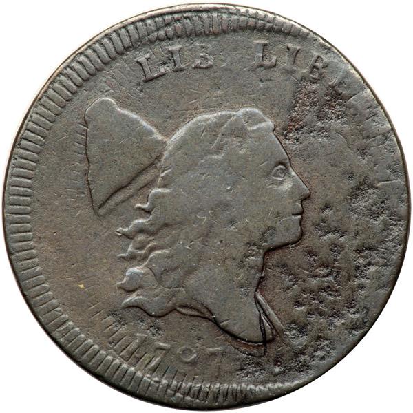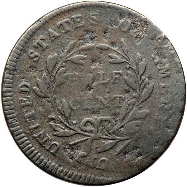 1797 C-2 R3 G6. Double Struck Off Center. Several points sharper but there are shallow pitmarks on both sides, mostly on the right half. No verdigris or contact marks. Glossy chocolate and olive with reddish chocolate toning inside the obverse pits. Double struck. The first strike was 25% off center to K-3 and the second was only slightly off center in the same direction. The doubling is obvious on both sides. LIBERTY now reads LIBELIBE and there is an extra fraction where the second A in AMERICA should be located. An additional UN is located where the centered fraction should show. An imperfect half cent but a neat error that is obvious to the unaided eye. Weight 83.0 grains. Davy #97.2.19.