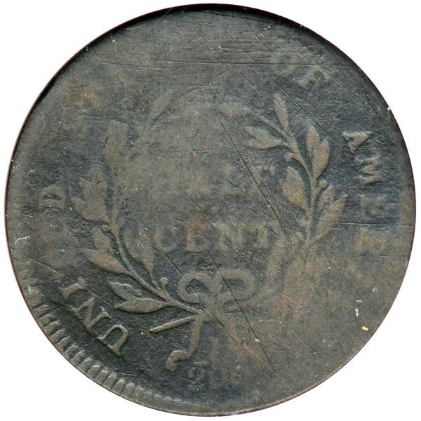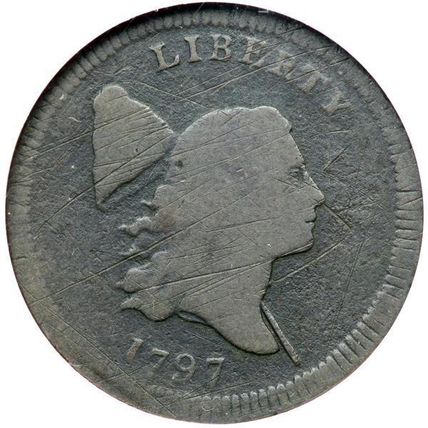 1797 C-2 R3 NCS graded Good details, scratches. The obverse has the sharpness of Good-6 while the reverse is several points weaker due in part to bulges from die swelling. The fields and protected areas are covered with very fine roughness and both sides display myriad fine scratches that blend perfectly into the natural patina. Slightly glossy dark olive with lighter steel and chocolate toning covering the devices. The date and LIBERTY are clear. Late die state. Our grade is net AG3+.