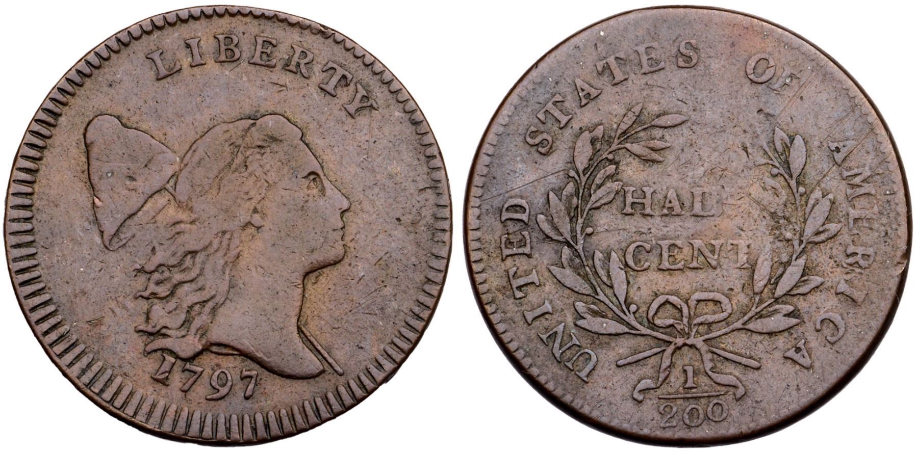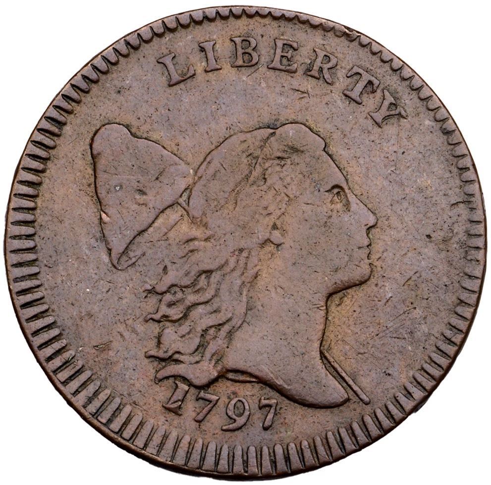 1797 C-3a R-3 Low Head VF20+5 points sharper with a few fine diagonal hairline scratches at F-AM, another right of the D in UNITED, and a faint one down through the Y in LIBERTY, plus a light rim nick at the R in AMERICA. Otherwise this piece is choice with outstanding eye appeal for the grade. Very attractive glossy medium brown and chocolate. EDS, Manley State 1.0. 80.2 grains. A premium example of the “Low Head” variety.Certificate Number: Pedigree: Ex; Superior 1/1989 - Ken Seachman - Superior 2/22/2005:1103 - Bob Kebler Collection