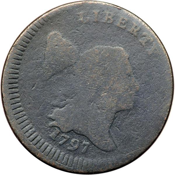 1797 C-3a R3 Low Head with Plain Edge AG3. Off Center. The obverse is slightly sharper while the reverse is a bit weaker, which is typical for well worn examples of this variety. Slightly glossy olive and dark steel brown. The surfaces are covered with uniform extremely faint roughness under the natural patina, but there is no verdigris. The only mark is a thin, very old scratch at the upper left of the reverse. The date and LIBERTY are complete and clear but less than half the legend on the reverse remains visible. Struck 5-10% off center to K-2. Weight 75.3.grains. Davy #97.3a.7.