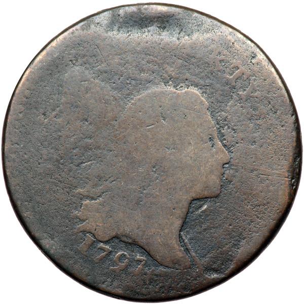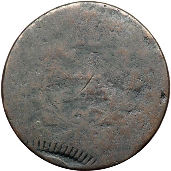1797 C-3a R3 Low Head with Plain Edge Fair-2. Struck over Spoiled Large Cent. Slightly glossy chocolate and darker steel brown. The surfaces are decent but not perfectly smooth. The rim off the bust tip is slightly beveled thanks to a dull contact mark and there are a couple light scratches in the center of the reverse. None of the marks is significant, especially considering the low grade. The date is clear. Struck on a planchet cut from a spoiled large cent. The tip of the bust of Ms Liberty from the cent shows clearly inside an arc of cent dentils at the bottom of the reverse. The opposing area on the obverse is indented, and it is reasonable to assume the indent was present on the spoiled cent planchet before the half cent planchet was cut from it. A really neat mint error in spite of the low grade (although it could be argued that this is a large cent error, not a half cent error). Semantics. Weight 74.5 grains. Davy #97.3a.12.