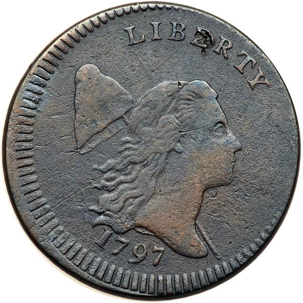 1797 C-3a R3 Low Head with Plain Edge VG10. Sharpness VF25 but covered with uniform microscopic granularity. No verdigris, but there is a dig on the E in LIBERTY that obliterates much of that letter plus a hairline scratch from that E through the cap. These marks blend perfectly into the dark chocolate and olive toning. Nicely struck but slightly off center to K-2. EDS, Manley state 1.0 early, clearly earlier than the Manley plate coin for that die state. There is no trace of the die crack from the chin. The date and legends are bold. Weight 77.2 grains.