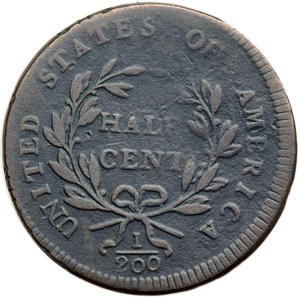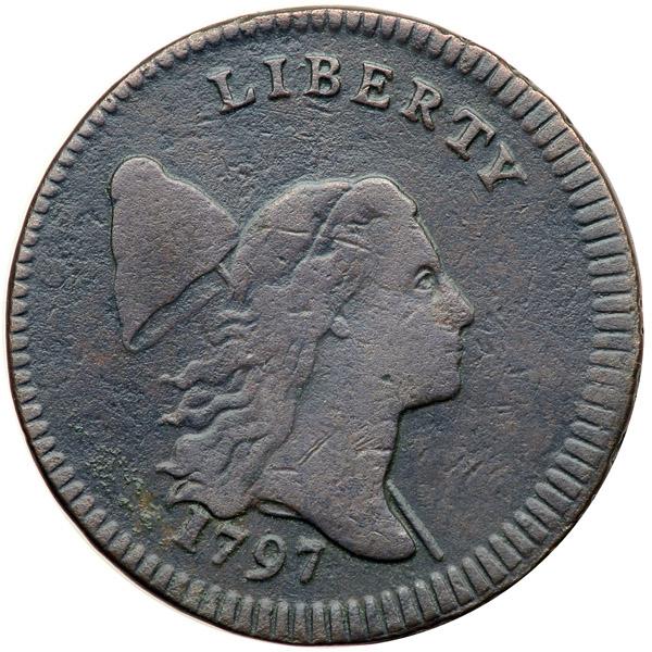 1797 C-3b R4 Low Head with Lettered Edge F12. Slightly sharper but the planchet is covered with very fine roughness that is partially hidden under a rather glossy patina of chocolate and dark olive brown. There are traces of microscopic verdigris on both sides, strongest in the field left of the date. Contact marks are limited to a few light nicks on the neck, a couple more hidden in the hair at the top of the head, and a pinprick left of the base of the H in HALF. MDS, Manley state 2.0, with a gentle horizontal bulge extending from the chin to the dentils. Struck slightly off center to K-9. The date is strong and the legends are complete. The edge letters are strong and easily readable, although they hang off the edge because they are too tall for the thin planchet. Not perfect but still a rather nice example of the popular "Low Head with Lettered Edge" variety. This is the Manley plate coin for die state 2.0 and this piece is mentioned in the Breen encyclopedia on page 188 as the sixth finest in his census. Finer than the Brobston coin sold in 1963 (Stack's FPL 1/1963). Overall equal to the R. L. Miles, Jr., example (Stack's 4/10/1969:9). Graded F15 by Roger S. Cohen, Jr. on 12/4/1982. Noyes photo #73606. Weight 80.0 grains.