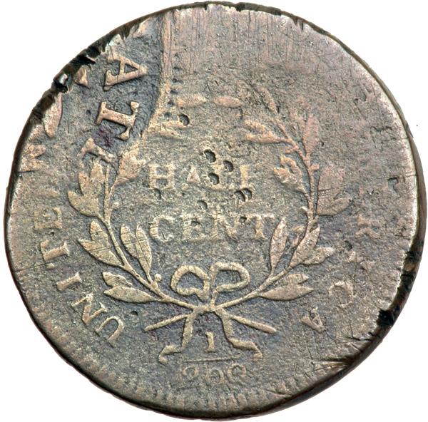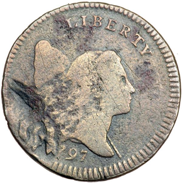 1797 C-3b R4 Low Head with Lettered Edge G5. Struck over a Large Cent that was Double Struck Off Center. A couple points sharper but fine roughness covers both sides and there are patches of very fine reddish verdigris dusted on the obverse, especially at LIB and in the field before the eye. In addition, there are some light hairline scratches down the portrait and a few rim nicks on the reverse. Slightly glossy light olive brown and chocolate. Struck over a double struck cut-down large cent. The hair ribbon from one of the cent strikes shows strongly on the lower curls, and the cent undertype obliterates the 1 in the half cent date. On the reverse is strong cent undertype of ATE from STATES covering the area where STATES would have been on the half cent, and weaker but unmistakable undertype from STATES also shows at the tops of OF-AMER (which proves the double-struck status of the cent undertype). The edge lettering is mostly strong but a few of the letters are distorted by the rim nicks. The reverse is plated on page 29 in Roger CohenÆs second edition of his half cent book to illustrate the "Large Cent Planchet" undertype because the evidence is so strong. Weight 90.0 grains. Davy #97.3b.7.