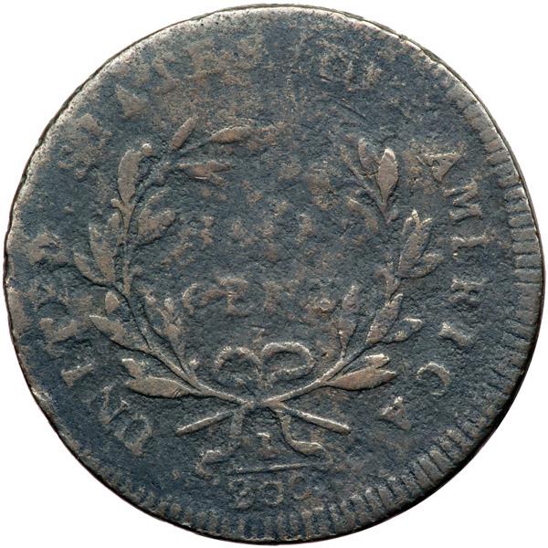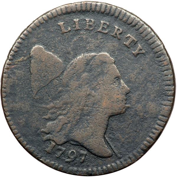 1797 C-3b R4 Low Head with Lettered Edge VG7. Blundered Edge Letters. A few points sharper, especially on the obverse, but the planchet is covered with fine granularity. No verdigris, and the only marks are some faint hairline scratches on the lower half of the obverse, all blended perfectly into the patina. Dark olive and steel with lighter steel brown toning on the devices. The date is strong and the legends are complete. LDS, Manley state 3.0. The "tongue" break from the chin is strong and the reverse is rotated 5 degrees CCW. Struck slightly off center to K-7.5. The edge lettering is complete but is blundered with DOLLARTWO appearing as a single word. Weight 77.0 grains. Davy #97.3b.1.