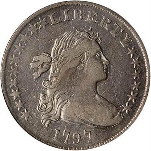 BB-71. The popular yet elusive Small Eagle, draped bust Type issued between 1795 and 1798. Dollars of this date are a study in contrast. Rather than differing by some minor feature, each is almost a "type." Thus, acquiring one each of the three will be an especially fascinating pursuit. The quest is not advised for the buyer who is conditioned to want Mint State coins, or even AU pieces. Better, he turn attention to something such as Morgan or Peace dollars, where there is hope of fulfillment. A splendid goal for a set of 1797 dollars would be Extremely Fine, and Very Fine is closer to reality such as offered here. (#6865)