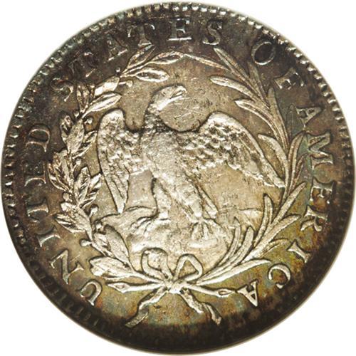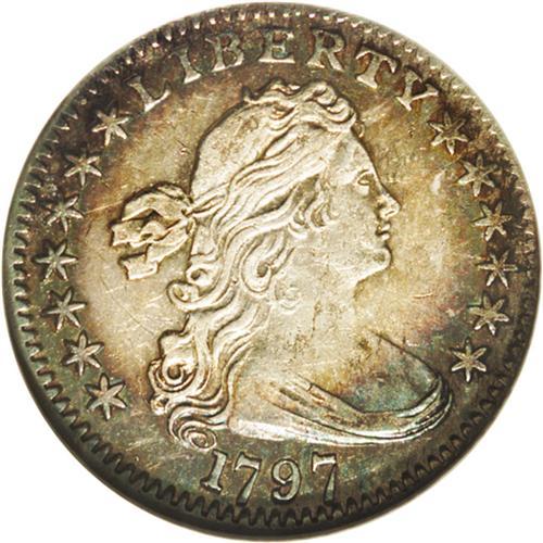 <B>1797<H10C> 13 Stars AU58 NGC.</B></I> V-1, LM-4, R.6. After Tennessee was admitted as the 16th state in 1796, an additional star to represent the new state was added to the coinage designs for the various denominations. The small canvas of the half dime became crowded with peripheral stars. Soon, it was realized that adding another star for each state was impractical, and the star count was reduced to 13 stars, which represented the 13 colonies that declared independence from Great Britain on July 4, 1776. The four half dime die varieties of 1797 have three different star counts: 15, 16, and 13 stars. The latter subtype is represented by a single rare die pairing, LM-4, which receives its own <I>Guide Book</B></I> listing. The rarity of the 13 stars subtype is best demonstrated by its NGC census. The service has certified only four pieces across all grades, and the present piece is tied with one other for finest certified by NGC. PCGS has encapsulated a single example as AU58, and just one piece finer, as MS63. Thus, the present coin is tied with two other examples for the honor of second finest certified, assuming that the three AU58 examples do not reflect any resubmissions (this is not the NGC AU58 Price specimen auctioned by ANR in 2004). Prior to the current lot, the highest graded 13 stars 1797 half dime to appear in a Heritage auction was a PCGS XF40 example in 2003. It is possible that no other sharp examples of the 13 stars variety will emerge for years, once the present lot has been sold. The importance of the present lot needs no further elaboration. It possesses bright silver-gray centers, framed by light golden-brown and deeper aquamarine and magenta toning. The strike is attentive, adjustment marks are absent, and no abrasions are detected that can provide a definitive pedigree.