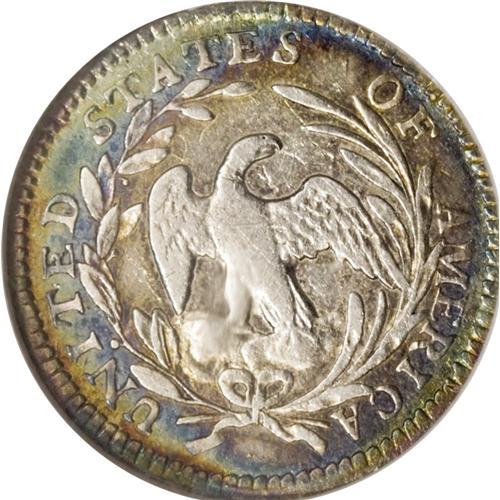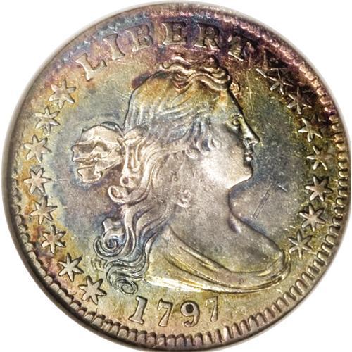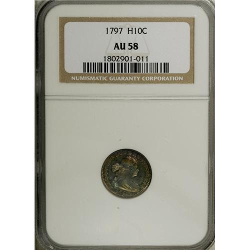 <B>1797 H10C 15 Stars AU58 NGC.</B></I> V-2, LM-1, R.3. The 7s in the date are equal in size, and the 1 in the date is connected to the nearby hair curl. The 15 stars are arranged eight left, seven right. On the reverse there is an outer berry between NI in UNITED. This delightfully patinated near-Gem offers bright silver centers on each side, with rainbow toning surrounding. The translucent toning allows much luster to still radiate from both sides. Perusal with a loupe reveals a couple of light scrapes on the obverse, but this piece has the appeal of a finer grade, and in fact is only a shade away from Mint State.<BR><BR><b>Shipping:</b> Coin/Currency (<a target="_blank" href="http://www.heritageauctions.com/common/shipping.php">view shipping information</a>)