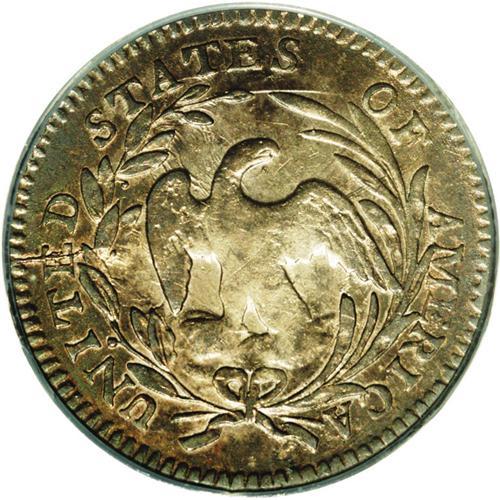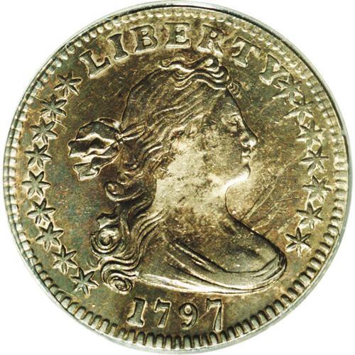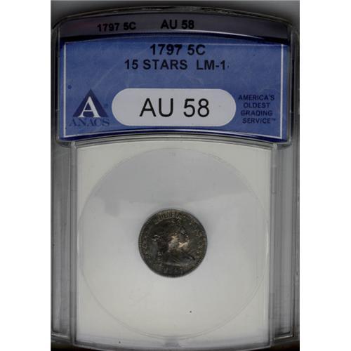<B>1797<H10C> 16 Stars AU58 ANACS.</B></I> V-4, LM-2, R.4. This is one of two varieties with 16 obverse stars. LM-2 has a leaf piercing the bottom of C at its center. The other 16 stars variety has a leaf close to the bottom of this letter but not touching. The surfaces are toned a deep, mottled charcoal-green and steel-gray coloration. The reverse is weakly defined, as usual, and there is an old pinscratch behind the ribbon of Liberty's hair. <BR><BR><B>Important notice:</B> Heritage usually auctions material at the rate of 200-250 lots per hour. On some occasions eBay Live bid software or the Internet may not be able to keep up with the pace of the auction. We recommend placing a realistic absentee bid now as insurance to avoid disappointment. Occasionally the auctioneer may eliminate or reject an eBay Live bid, and the auctioneer may also reopen a lot after the close of the eBay live bidding (usually because we missed an audience bid), and may reject your bid even if it shows you as the winning bidder. By bidding via eBay Live, you agree that Heritage may award the lot to another bidder at its sole discretion under the circumstances described above or any other reasonable circumstances. Since eBay bids are not shown to us until we open the lot on the floor, we treat those bids just like floor bids. In most cases the floor responds before the eBay bid is presented to us, due to Internet lag time, so for consistency we have made it a policy that floor bids are always considered first over tie eBay live bids. Also please note that all Heritage lots purchased through eBay Live carry a 20% Buyer's Premium. Please make sure you read the Terms and Conditions before you bid. This lot is being auctioned in conjunction with a live floor auction by Heritage Galleries & Auctioneers. All final auction and invoice information will be supplied by Heritage Galleries & Auctioneers, and all other information should be considered preliminary. Lot:1865 <BR><BR><B>Winning Notification and Billing:</B> After the FINAL session in this auction is complete, Heritage will send e-mail and snail mail invoices. This process normally takes several days. All final auction and invoice information will be supplied by Heritage Galleries & Auctioneers, and all other information should be considered preliminary. <BR><BR>This auction will be conducted on a live auction floor and over the Internet through eBay Live. If you choose to place an absentee bid, please take a moment to <font color='#0000ff'><u><a href='http://pages.ebay.com/liveauctions/help/before/laabsentee.html'>learn how eBay Live absentee bidding works</a></u></font><font color='#000000'>