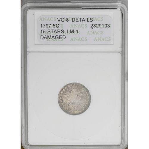 <B>1797<H10C> 15 Stars--Damaged--ANACS. VG8 Details.</B></I> V-2, LM-1, R.3. This moderately wavy early type coin is granular across the left obverse, and has a series of subdued digs and marks near Liberty's face. The reverse is less affected and has better eye appeal. <BR><BR><B>Important notice:</B> Heritage usually auctions material at the rate of 200-250 lots per hour. On some occasions eBay Live bid software or the Internet may not be able to keep up with the pace of the auction. We recommend placing a realistic absentee bid now as insurance to avoid disappointment. Occasionally the auctioneer may eliminate or reject an eBay Live bid, and the auctioneer may also reopen a lot after the close of the eBay live bidding (usually because we missed an audience bid), and may reject your bid even if it shows you as the winning bidder. By bidding via eBay Live, you agree that Heritage may award the lot to another bidder at its sole discretion under the circumstances described above or any other reasonable circumstances. Since eBay bids are not shown to us until we open the lot on the floor, we treat those bids just like floor bids. In most cases the floor responds before the eBay bid is presented to us, due to Internet lag time, so for consistency we have made it a policy that floor bids are always considered first over tie eBay live bids. Also please note that all Heritage lots purchased through eBay Live carry a 20% Buyer's Premium. Please make sure you read the Terms and Conditions before you bid. This lot is being auctioned in conjunction with a live floor auction by Heritage Galleries & Auctioneers. All final auction and invoice information will be supplied by Heritage Galleries & Auctioneers, and all other information should be considered preliminary. Lot:1864 <BR><BR><B>Winning Notification and Billing:</B> After the FINAL session in this auction is complete, Heritage will send e-mail and snail mail invoices. This process normally takes several days. All final auction and invoice information will be supplied by Heritage Galleries & Auctioneers, and all other information should be considered preliminary. <BR><BR>This auction will be conducted on a live auction floor and over the Internet through eBay Live. If you choose to place an absentee bid, please take a moment to <font color='#0000ff'><u><a href='http://pages.ebay.com/liveauctions/help/before/laabsentee.html'>learn how eBay Live absentee bidding works</a></u></font><font color='#000000'>