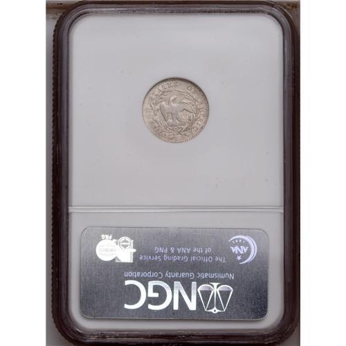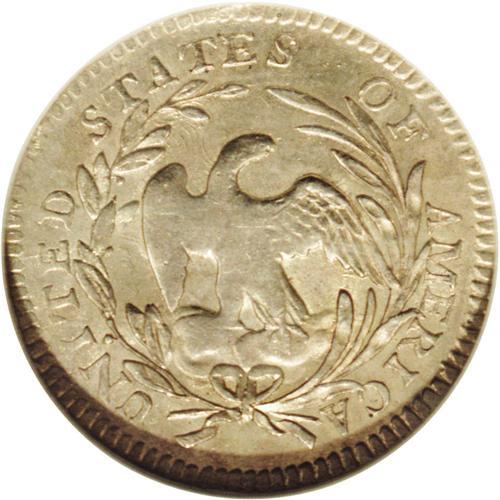 <B>1797<H10C> 15 Stars MS63 NGC.</B></I> V-2, LM-1, R.3. Similar to its half dollar counterpart, the Draped Bust, Heraldic Eagle half dime was produced for only two years, 1796 and 1797. Mintages were low, and Uncirculated survivors are rare. The present piece is delicately toned in honey-gray hues, and rotation beneath a light reveals satin cartwheel sheen. Unusually clean for the grade with no remotely mentionable marks. Striking softness, usual for the briefly struck type, is noted along Liberty's neck and on the eagle's body and left (facing) wing. All legends are sharp, however, and the right side stars are particularly crisp. LM-1 is the sole 15 stars variety for the date; other die pairings possess 13 or 16 stars.