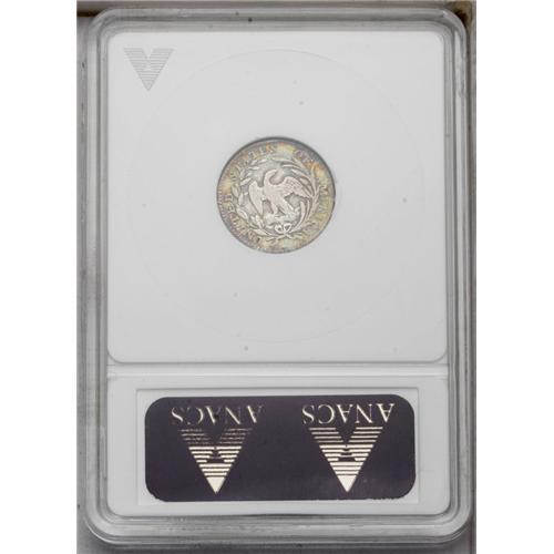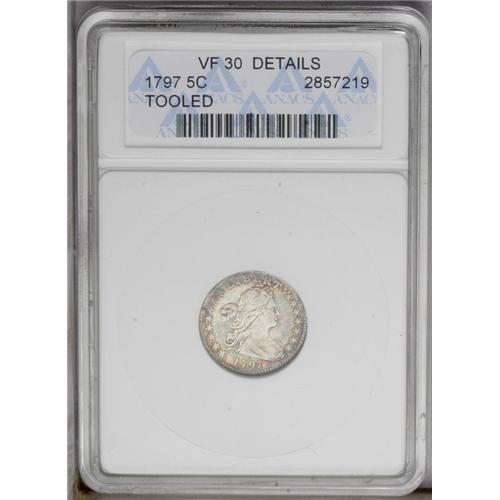 <B>1797<H10C> 15 Stars--Tooled--ANACS. VF30 Details.</B></I> V-2, LM-1, R.3. A great-looking early half dime, regardless of the net-graded holder, that is warmly accented in apricot and blue-green shades. A smoothed area along the obverse border from 9 o'clock to 11 o'clock is presumably the area affected by tooling.