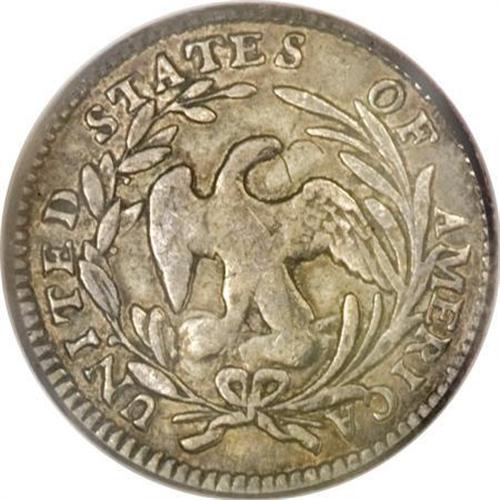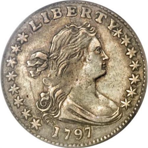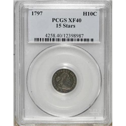 <B>1797 H10C 15 Stars XF40 PCGS.</B></I> V-2, LM-1, R.3. The sole 15 Stars variety. Deep steel-gray toning embraces this unblemished Small Eagle half dime. The centers are somewhat soft, as usual for the die pairing, but Liberty's hair is sharply defined near her shoulder and forehead. The lower reverse exhibits minor strike doubling.<BR><BR><B>Coin Engraver:</B> Robert Scot<BR><BR><b>Shipping:</b> Coins & Currency (<a target="_blank" href="http://www.heritageauctions.com/common/shipping.php">view shipping information</a>)