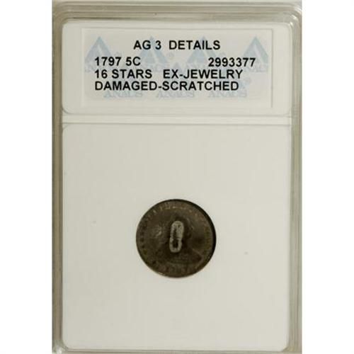 <B>1797 H10C 16 Stars--Damaged, Ex-Jewelry, Scratched--ANACS. AG3 Details.</B></I> NGC Census: (0/0). PCGS Population (0/53). Numismedia Wsl. Price for NGC/PCGS coin in AG3 : $580. (#4259)<BR><BR><B>Coin Engraver:</B> Robert Scot<BR><BR><b>Shipping:</b> Coins & Currency (<a target="_blank" href="http://www.heritageauctions.com/common/shipping.php">view shipping information</a>)
