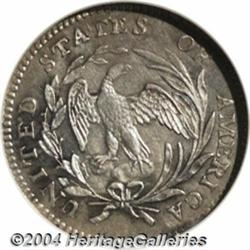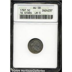 <B>1797<H10C> 16 Stars AU58 ANACS.</B></I> V-3, LM-3, R.5. Milky apricot and lilac colors embrace this richly defined Draped Bust, Small Eagle Half Dime. Nearly all of the breast feathers are present, and on the obverse, rub is generally limited to Liberty's shoulder. The 15 Stars variety (Valentine-2) is the usually encountered 1797 marriage, and V-3 is the rarest among the two 16 Stars die pairings. The admission of Tennessee to the union increased the number of obverse stars. Since any additional states threatened to crowd the obverse, mint policy was modified for the final variety of the year (V-1) to revert to 13 stars, which represent the original colonies.<BR><I>From The Willamette Collection.</B></I> <BR><BR><B>Important notice:</B> Heritage usually auctions material at the rate of 200-250 lots per hour. On some occasions eBay Live bid software or the Internet may not be able to keep up with the pace of the auction. We recommend placing a realistic absentee bid now as insurance to avoid disappointment. Occasionally the auctioneer may eliminate or reject an eBay Live bid, and the auctioneer may also reopen a lot after the close of the eBay live bidding (usually because we missed an audience bid), and may reject your bid even if it shows you as the winning bidder. By bidding via eBay Live, you agree that Heritage may award the lot to another bidder at its sole discretion under the circumstances described above or any other reasonable circumstances. Since eBay bids are not shown to us until we open the lot on the floor, we treat those bids just like floor bids. In most cases the floor responds before the eBay bid is presented to us, due to Internet lag time, so for consistency we have made it a policy that floor bids are always considered first over tie eBay live bids. Also please note that all Heritage lots purchased through eBay Live carry a 20% Buyer's Premium. Please make sure you read the Terms and Conditions before you bid. </span></font></tr></table></td></tr></table>