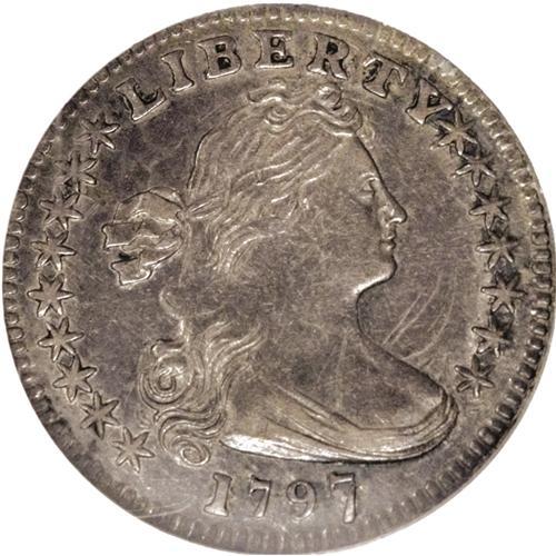 <B>1797<H10C> 16 Stars AU58 NGC.</B></I> V-4, LM-2, R.4. This is one of two varieties with 16 obverse stars. LM-2 has a leaf piercing the bottom of C at its center. The other 16 stars variety has a leaf close to the bottom of this letter but not touching. The final 7 in the date is larger than the other digits, and it is broken at the junction of the upright and top. The obverse has parallel cracks from the border to stars 7 and 8, the lower crack continuing into the field between these stars, the upper crack joining the upper outside point of star 8. The reverse has a small rim break in the dentils over ME. Clash marks are visible on both sides. Like nearly every example of the design, this lovely coin has central weakness on both sides with little detail on the eagle. Nearly full luster is visible beneath deep steel-blue color with a slightly lighter appearance on the reverse. The surfaces are exceptional for the grade with only a few faint scratches and blemishes.