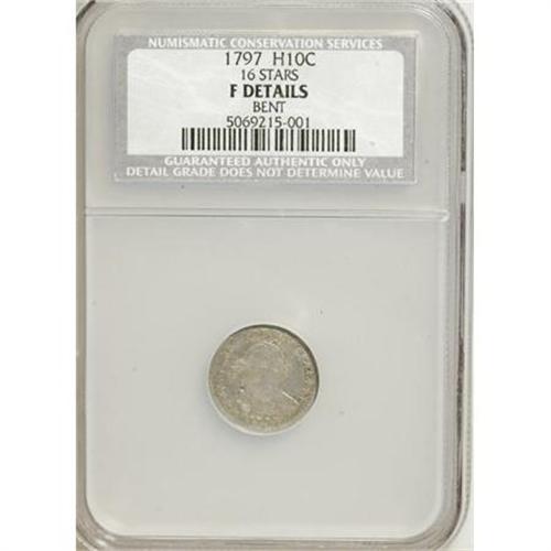 <B>1797 H10C 16 Stars--Bent--NCS. Fine Details.</B></I> V-4, LM-2, R.4. Light silver surfaces with splashes of pale blue toning. A tiny dent on the obverse slightly bends the coin, as described on the holder, yet this is a pleasing and desirable 18th century silver type coin.<BR><BR><B>Coin Engraver:</B> Robert Scot<BR><BR><b>Shipping:</b> Coins & Currency (<a target="_blank" href="http://www.heritageauctions.com/common/shipping.php">view shipping information</a>)