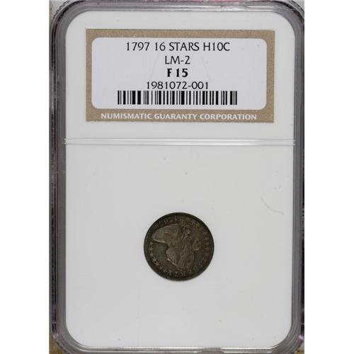 <B>1797 H10C 16 Stars Fine 15 NGC.</B></I> V-4, LM-2, R.4. The dove-gray devices are sharply defined for the Fine 15 grade, and display moderate contrast with the charcoal-gray fields. Minutely granular, and Liberty's neck displays faint, close marks.<BR><BR><b>Shipping:</b> Coins & Currency (<a target="_blank" href="http://www.heritageauctions.com/common/shipping.php">view shipping information</a>)