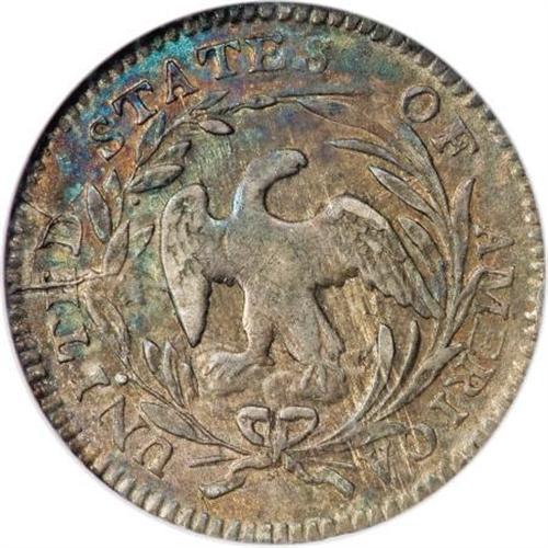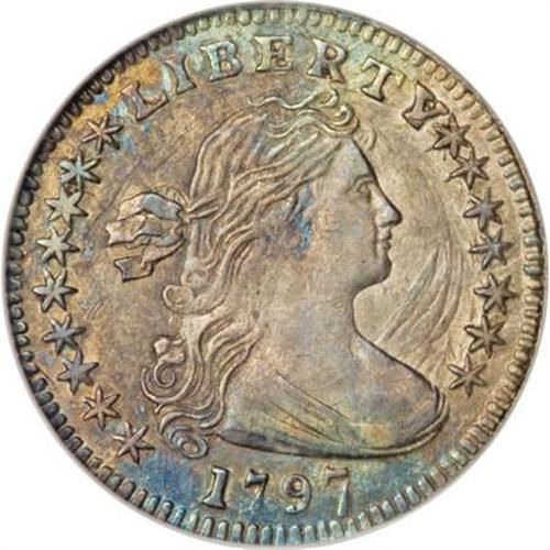 <B>1797 H10C 16 Stars MS62 NGC.</B></I> V-4, LM-2, R.4. This attractive example offers a melange of medium golden-gray patina with lavender, crimson and aqua-blue accents. A few light toning streaks are apparent on the lower right reverse. The design elements are well struck save for the expected softness in the centers, and nicely centered on the planchet, with virtually all of the dentilation showing. Heavy die clashing is noted in the right obverse field. As most Draped Bust Small Eagle half dime survivors are in low grades, this is an excellent opportunity to acquire a handsome Mint State example.<BR><BR><B>Coin Engraver:</B> Robert Scot<BR><BR><b>Shipping:</b> Coins & Currency (<a target="_blank" href="http://www.heritageauctions.com/common/shipping.php">view shipping information</a>)