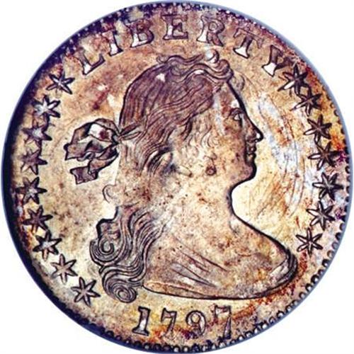 <B>1797 H10C 16 Stars MS64 NGC. CAC.</B></I> V-4, LM-2, R.4. Of the four 1797 half dime die marriages, two display 16 stars on the obverse: LM-3 and LM-2, the current coin, distinguishable by the leaf tip that pierces the bottom of C in AMERICA and a berry between N and I in UNITED. The other two varieties have 13 stars and 15 stars. Breen (1988) conjectures that the 15 star coins were struck first from unfinished dies started in 1796, then the 16 star half dimes were issued in anticipation of Tennessee being admitted to the Union as the 16th state. He goes on to explain that Mint Director Boudinot decided to start making obverse dies of all denominations with 13 stars since it would be impractical to keep adding stars for each new state. Breen's logic is confirmed through an examination of 1797 half dime die states; the LM-2 16 Stars variety uses a later die state of the LM-1 15 Stars reverse die.<BR> The current coin represents the finest graded 1797 half dime, regardless of variety, that we have offered in nearly 10 years. The NGC <I>Census Report </B></I>indicates that only one 1797 LM-2 half dime has been certified at the MS64 level with one finer (1/08), although the same report includes another line for this issue that represents unattributed submissions, with an additional 11 examples graded Choice Uncirculated. We must assume that part of that total includes other 1797 LM-2 half dimes. The near-Gem offered here displays an attractive russet patina with steel-blue and silver undertones. The centers are weakly struck as usual for this variety, yet the distraction-free and lustrous surfaces justify the assigned grade. <BR><I>From The Southwest Collection.</B></I><BR><BR><B>Coin Engraver:</B> Robert Scot<BR><BR><b>Shipping:</b> Coins & Currency (<a target="_blank" href="http://www.heritageauctions.com/common/shipping.php">view shipping information</a>)