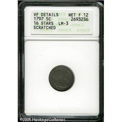 <B>1797 H10C 16 Stars--Scratched--ANACS. VF Details, Net Fine 12.</B></I> V-3, LM-3, R.5. A berry below the upright of the D in UNITED is diagnostic of this scarcer variety. A couple of light pinscratches are noted on Liberty's bust, and another through Liberty's hair and into the left obverse field. These are evident, but not seriously detracting. Indeed, this is a very pleasing coin overall, with attractive battleship-gray patina. The well defined design elements are nicely centered on the planchet. Lot:6100