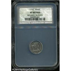 1797 H10C 16 Stars XF Details, Repaired, Whizzed, NC <B>1797 H10C 16 Stars XF Details, Repaired, Whizzed, NCS.</B></I> V-4, LM-2, R.4. The hair near the ear is crudely tooled, and both sides are somewhat wavy and have been smoothed and whizzed. A few pinprick marks frequent the reverse. A dove-gray survivor of this difficult variety. Three different star counts were used for 1797 Half Dimes, the addition of Tennessee to the Union generated the 16 Stars subtype before the mint decided to revert to the less crowded 13 Stars motif. <BR><BR><B>Important notice:</B> Heritage usually auctions material at the rate of 200-250 lots per hour. On some occasions eBay Live bid software or the Internet may not be able to keep up with the pace of the auction. We recommend placing a realistic absentee bid now as insurance to avoid disappointment. Occasionally the auctioneer may eliminate or reject an eBay Live bid, and the auctioneer may also reopen a lot after the close of the eBay live bidding (usually because we missed an audience bid), and may reject your bid even if it shows you as the winning bidder. By bidding via eBay Live, you agree that Heritage may award the lot to another bidder at its sole discretion under the circumstances described above or any other reasonable circumstances. Since eBay bids are not shown to us until we open the lot on the floor, we treat those bids just like floor bids. In most cases the floor responds before the eBay bid is presented to us, due to Internet lag time, so for consistency we have made it a policy that floor bids are always considered first over tie eBay live bids. Also please note that all Heritage lots purchased through eBay Live carry a 20% Buyer's Premium. Please make sure you read the Terms and Conditions before you bid. This lot is being auctioned in conjunction with a live floor auction by Heritage Galleries & Auctioneers. All final auction and invoice information will be supplied by Heritage Galleries & Auctioneers, and all other information should be considered preliminary. Lot:5664
