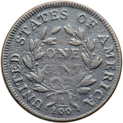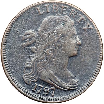 1797 NC-3 R6-. VG-8. Sharpness near VF20 but covered with fine granularity that’s mostly hidden under a glossy dark olive brown patina. The highpoints are a few shades lighter chocolate and steel brown. No verdigris, but there are a dozen tiny pitmarks in the hair and a short scratch in the field left of the hair ribbon. The date and legends are strong except for CENT, which is weak but visible. MDS, Breen state II. A fine die crack passes through the tops of TES in STATES. Called VF20 net VG8 and CC#2 in the Bland census. Noyes says F15 net VG7 and tied for CC#2, his photo #21178. The finest known example, a sharper piece that is corroded and damaged (Noyes net graded VG10 scudzy), is in the ANS Museum collection. DWH #3196.