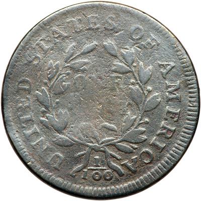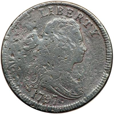1797 NC-6 R8. Good-4. Discovery Coin. Plated in Breen and Noyes. Sharpness VG8 but the planchet is slightly bent and the obverse is covered with light to moderate nicks. The surfaces are reasonably smooth and slightly glossy, but very fine roughness covers much of the planchet, strongest in the field left of the hair ribbon. The most notable contact mark is a dull nick on the dentils opposite the throat. Dark steel brown with traces of reddish chocolate brown in protected areas. The highpoints appears to have been retoned long ago, but the color is decent. The date is bold and legends complete, although CEN in CENT is faint due to a slight bulge in that area. Overall the obverse is several points sharper than the reverse. EDS, Breen state I. This is the discovery coin for the variety and the finest of only 2 known. Plated in Noyes and Breen. Called VG7 net G4 and finest known in both census lists, Noyes photo #21355. DWH #1781.