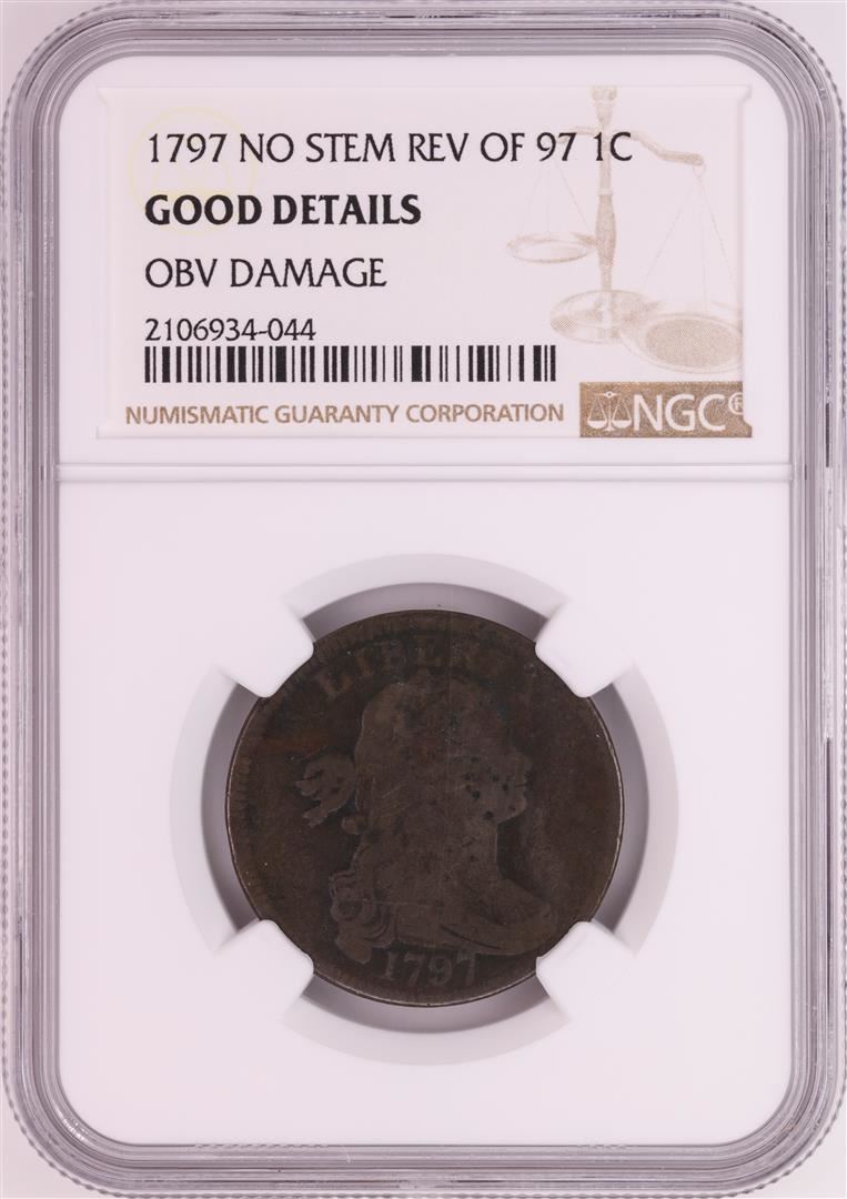 One 1797 No Stem Rev of 97' Draped Busted Large Cent Coin NGC Good Details. NGC Certified.