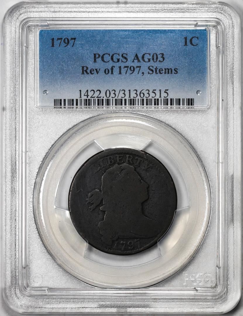 One 1797 Reverse of 1797 Stems Draped Bust Large Cent Coin PCGS AG03. PCGS Graded.
