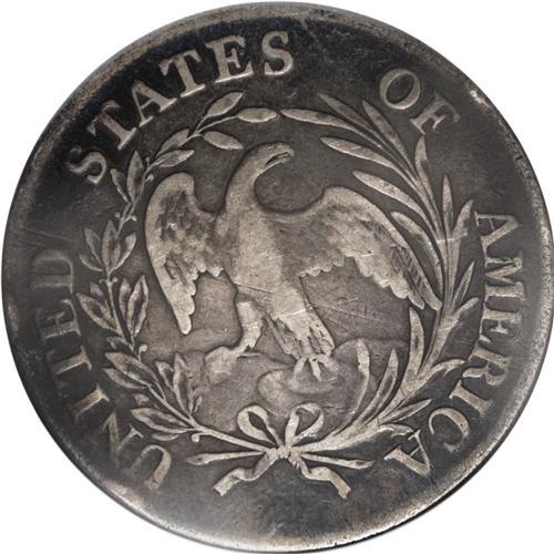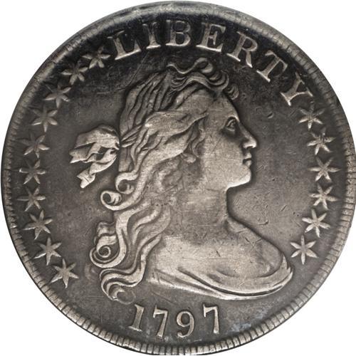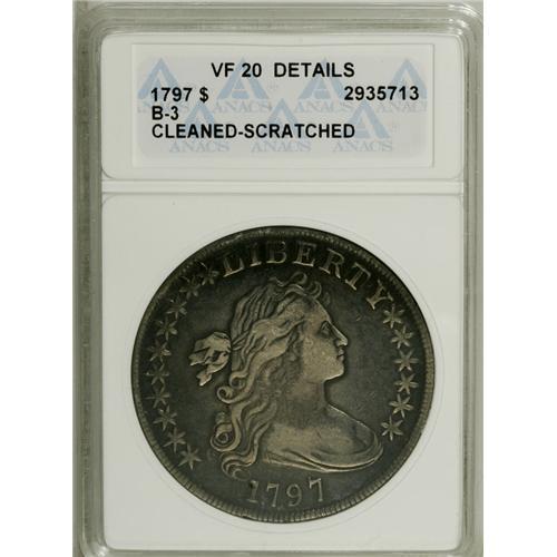<B>1797 S$1 10x6 Stars--Cleaned, Scratched--ANACS. VF20 Details.</B></I> B-3, BB-71, R.2. The only 1797 variety with the 10x6 star division. Magnification reveals some fine hairlines on the light to medium gray surfaces. The fields possess somewhat deeper hues, thereby highlighting the well centered, sharply defined design elements. A few shallow, short scratches are noted on the obverse, and a couple of roller marks are located on the reverse. Actually not that bad despite the ANACS disclaimers.<BR><BR><b>Shipping:</b> Coins & Currency (<a target="_blank" href="http://www.heritageauctions.com/common/shipping.php">view shipping information</a>)