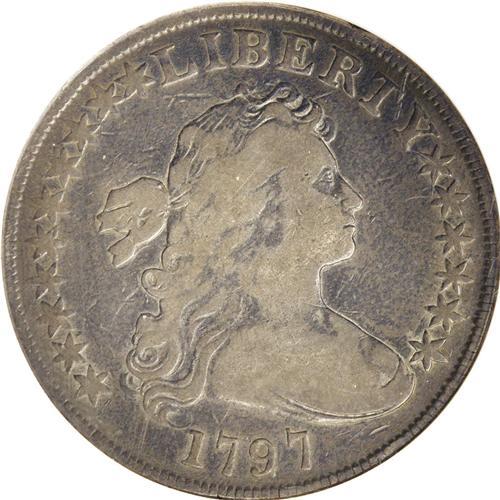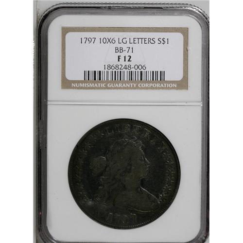 <B>1797<img border='0' src='http://www.heritagecoins.com/images/star.gif' width=10 height=10>$1> 10x6 Stars Fine 12 NGC.</B></I> B-3, BB-71, R.2. The surfaces of this well worn example display deep charcoal-gray toning that fades to lighter steel-gray on selected highpoints. Numerous small abrasions are present, but none are out of context with the grade level.