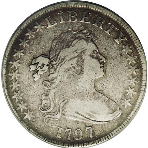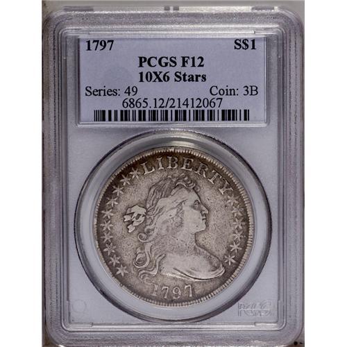 <B>1797<img border='0' src='http://www.heritagecoins.com/images/star.gif' width=10 height=10>$1> 10x6 Stars Fine 12 PCGS.</B></I> B-3, BB-71, R.2. Myriad abrasions are visible on each side of this pleasing light gray and iridescent example. A couple tiny reverse rim bruises do not take away from the overall eye appeal. Although the grade may have been adjusted slightly downward due to the surface quality, there is nothing wrong with the appearance overall.