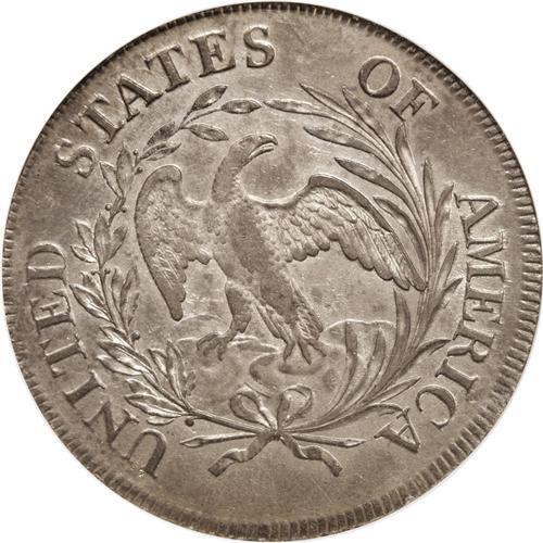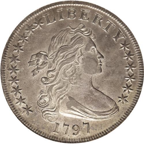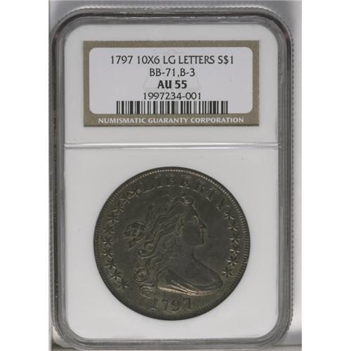 <B>1797<img border='0' src='http://www.heritagecoins.com/images/star.gif' width=10 height=10>$1> 10x6 Stars, Large Letters AU55 NGC.</B></I> B-3, BB-71, R.2. Die State III. This lovely and historic coin illustrates an unanticipated problem that the nascent U.S. Mint faced. In 1791 Vermont joined the Union as the 14th state, followed in 1792 by Kentucky. Many of the early Mint issues before 1797 had 15 stars (or links, only on the Flowing Hair, Chain cents), one for each state. By 1796, when Tennessee joined as the 16th state, Mint officials realized that agglomerating stars to coinage designs for each new state could not continue. The 1797-dated dollars are known with stars arranged both 10x6 (only on the BB-71) and 9x7 (on the BB-72 and -73). There are many later exceptions due to die reuse, Mint error, and other reasons, but by the early 19th century, Mint officials began standardizing the number of stars at the "original 13."<BR> This specimen has the 10x6 arrangement, with both dies used monogamously in this marriage. A small dot punctuates the date 17.97. The Large Letters reverse has a leaf ending under the middle of the E in STATES. Stars 9 and 10 are shorter at their inner points, and die lapping has removed the right edges of some of the olive leaves. While most dollars of this year are found in lower circulated grades, this beautiful piece is just a hair's breadth away from Mint State, showing a touch of rub on the cheek and the eagle's breast. However, it is boldly executed on one of the larger planchets for the variety, with good centering, bold dentilation, and excellent detail throughout. The surfaces appear dark gray, but rotation under a light reveals much buried luster and a pleasing copper-gold cast on both sides. There is minimal evidence of contact or other distractions.<BR><I>From The Royal Oak Collection.</B></I>