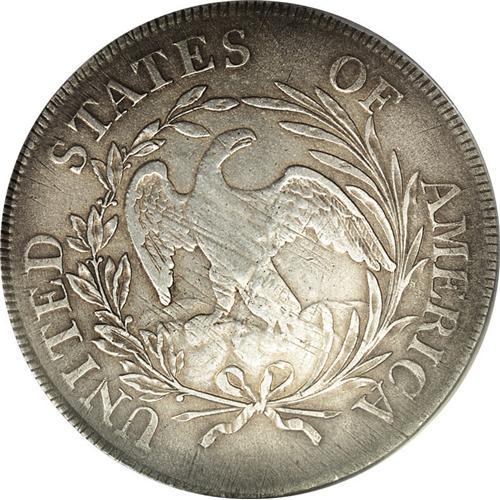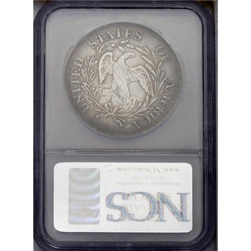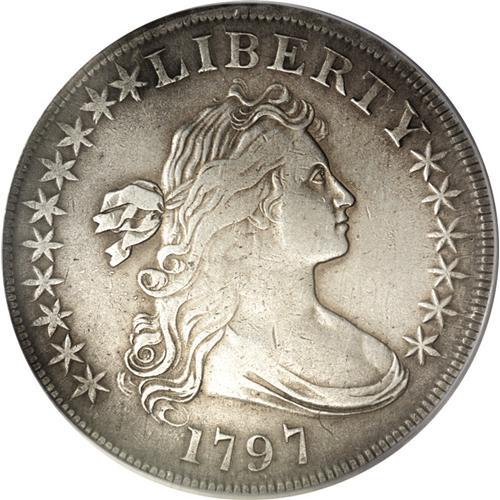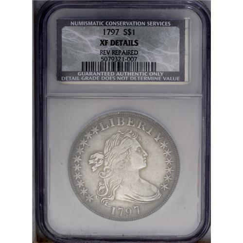 <B>1797<img border='0' src='http://www.heritagecoins.com/images/star.gif' width=10 height=10>$1> 10x6 Stars--Reverse Repaired--NCS. XF Details.</B></I> B-3, BB-71, R.2. This relatively sharp Draped Bust dollar is granular from whizzing. The small eagle and nearby field are glossy, but no repair is obvious. Moderate adjustment marks cross portions of the reverse. Steel-gray toning is augmented by tan-brown in protected areas. <BR><BR><B>Important notice:</B> Heritage usually auctions material at the rate of 200-250 lots per hour. On some occasions eBay Live bid software or the Internet may not be able to keep up with the pace of the auction. We recommend placing a realistic absentee bid now as insurance to avoid disappointment. Occasionally the auctioneer may eliminate or reject an eBay Live bid, and the auctioneer may also reopen a lot after the close of the eBay live bidding (usually because we missed an audience bid), and may reject your bid even if it shows you as the winning bidder. By bidding via eBay Live, you agree that Heritage may award the lot to another bidder at its sole discretion under the circumstances described above or any other reasonable circumstances. Since eBay bids are not shown to us until we open the lot on the floor, we treat those bids just like floor bids. In most cases the floor responds before the eBay bid is presented to us, due to Internet lag time, so for consistency we have made it a policy that floor bids are always considered first over tie eBay live bids. Also please note that all Heritage lots purchased through eBay Live carry a 20% Buyer's Premium. Please make sure you read the Terms and Conditions before you bid. This lot is being auctioned in conjunction with a live floor auction by Heritage Galleries & Auctioneers. All final auction and invoice information will be supplied by Heritage Galleries & Auctioneers, and all other information should be considered preliminary. Lot:2119 <BR><BR><B>Winning Notification and Billing:</B> After the FINAL session in this auction is complete, Heritage will send e-mail and snail mail invoices. This process normally takes several days. All final auction and invoice information will be supplied by Heritage Galleries & Auctioneers, and all other information should be considered preliminary. <BR><BR>This auction will be conducted on a live auction floor and over the Internet through eBay Live. If you choose to place an absentee bid, please take a moment to <font color='#0000ff'><u><a href='http://pages.ebay.com/liveauctions/help/before/laabsentee.html'>learn how eBay Live absentee bidding works</a></u></font><font color='#000000'>