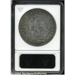 <B>1797<S$1> 10x6 Stars--Scratched, Cleaned--ANACS. Fine Details, Net VG8.</B></I> B-3, BB-71, R.1. The right obverse field has an intersecting pair of deep pinscratches, the Small Eagle displays bright slide marks, and the obverse field is glossy from a moderate cleaning. The bright sea-green, golden-brown, and lilac patina is attractive.<BR><I>From The Paulsboro Collection, Part Two.</B></I> <BR><BR><B>Important notice:</B> Heritage usually auctions material at the rate of 200-250 lots per hour. On some occasions eBay Live bid software or the Internet may not be able to keep up with the pace of the auction. We recommend placing a realistic absentee bid now as insurance to avoid disappointment. Occasionally the auctioneer may eliminate or reject an eBay Live bid, and the auctioneer may also reopen a lot after the close of the eBay live bidding (usually because we missed an audience bid), and may reject your bid even if it shows you as the winning bidder. By bidding via eBay Live, you agree that Heritage may award the lot to another bidder at its sole discretion under the circumstances described above or any other reasonable circumstances. Since eBay bids are not shown to us until we open the lot on the floor, we treat those bids just like floor bids. In most cases the floor responds before the eBay bid is presented to us, due to Internet lag time, so for consistency we have made it a policy that floor bids are always considered first over tie eBay live bids. Also please note that all Heritage lots purchased through eBay Live carry a 20% Buyer's Premium. Please make sure you read the Terms and Conditions before you bid. </span></font></tr></table></td></tr></table>