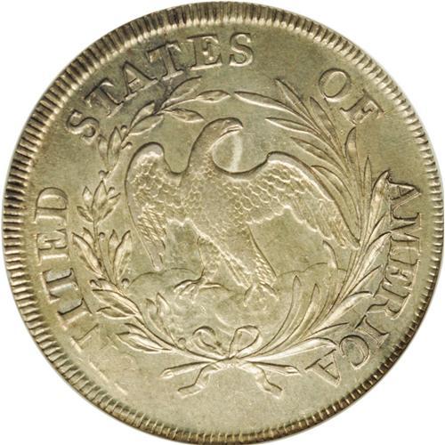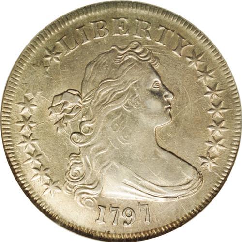 <B>1797<img border='0' src='http://www.heritagecoins.com/images/star.gif' width=10 height=10>$1> 9x7 Stars, Large Letters AU58 NGC.</B></I> B-1, BB-73, R.3. Die State VI. This is the latest die state we have seen of this variety, even later than lot 23492 in Reiver, described as the terminal die state for this variety. Indeed, Q. David Bowers specifically mentioned the Gilhousen coin as an example of this die state. In the catalog for that collection, Superior described this piece as "the most advanced die state known, shattered and bulged." Not only is this example remarkable for its die state, but it is also a gorgeous near-Mint example with traces of rub only on the highpoints. The surfaces retain nearly full luster with light golden toning. A small nick at the base of B positively identifies the pedigree.<BR> In addition to heavy clash marks in the obverse fields, especially to the right of Liberty, the obverse has a prominent bulge obliterating stars 7 and 8. There are no less than 12 distinct die cracks around the obverse. It is difficult to enumerate these die cracks, but we will try. 1) From the border through the left top of T to Liberty's hair, crossing the hair ribbon to stars 5 and 4, reaching the rim over star 3. 2) From the border to star 12, reaching Liberty's chin and neck. 3) From the base of 97 to the drapery, eventually reaching stars 15 and 14. 4) From the border at 5 o'clock across the drapery and hair, terminating at crack 1 just right of the ribbon. 5) From the border through 9 to Liberty's shoulder and lower hair curls, eventually arcing back to star 2 and the border. 6) From the border just left of the digit 1, disappearing in the lowest hair curl. 7) A faint crack begins in the lowest curl just left of crack 6, continuing up to the hair ribbon and crack 1. 8) From crack 5 in the left field, past the inner points of stars 3 and 4 to crack 1. 9) Faintly between stars 5 and 6, curving up along the inside edge of the die bulge. 10) F
