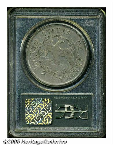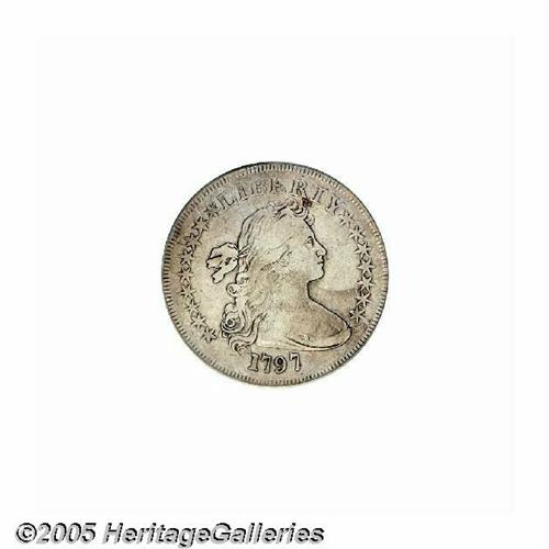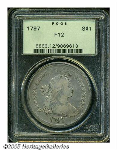 <B>1797<S$1> 9x7 Stars, Large Letters Fine 12 PCGS.</B></I> B-1, BB-73, R.2. Deep pearl-gray patina embraces this refreshingly unabraded example. The eagle's wings and Liberty's hair curls have some remaining definition. A tiny rim ding near 1 o'clock on the reverse is barely worthy of individual mention. Housed in a prior generation holder.